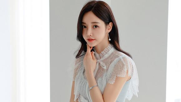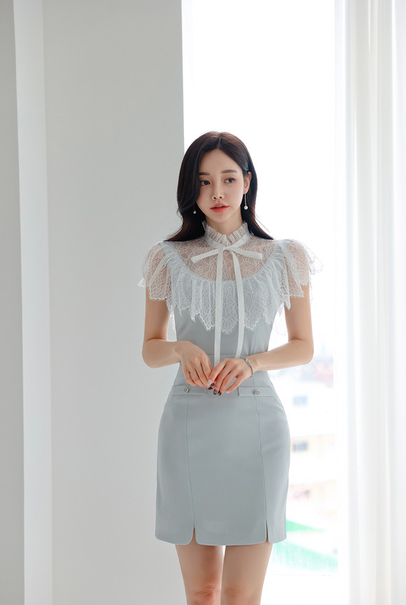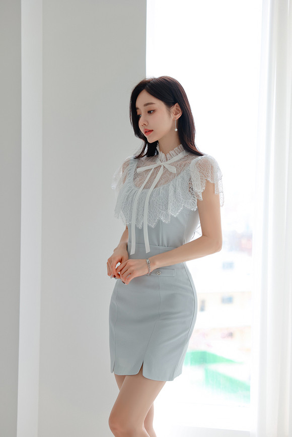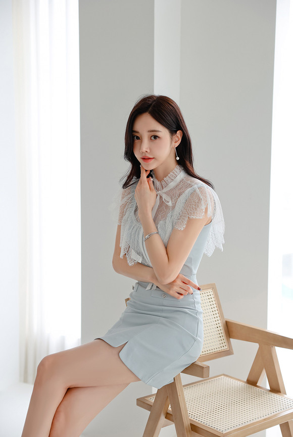 孙允珠: 浅蓝蕾丝短裙, 蝴蝶结系带点缀纤腰, 蕾丝拼接透出柔美质感