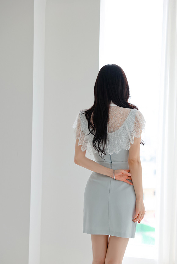 女孩身着浅蓝蕾丝短裙,蝴蝶结系带点缀纤腰,蕾丝拼接透出柔美质感。高挑身姿搭配白色高跟,如夏日清风般清新婉约,每一步都绽放优雅魅力。